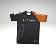 - Rash guard features belt rank color across left shoulder